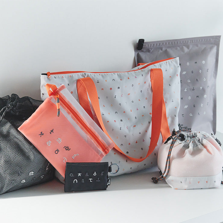 種類豊富な地図記号のうち、建物・植生・構造物・特定地区に関わる20種を組み合わせました。ライトグレーをベースに旅行シーンを盛り上げるアクティブな雰囲気のオレンジをポイントにデザインしました。