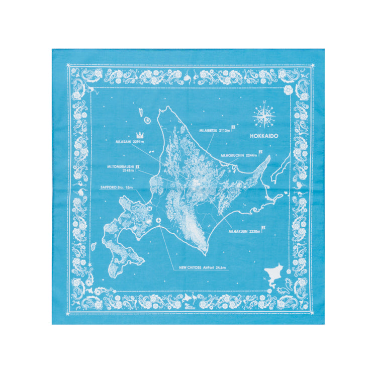 都道府県別に等高線・道の花や鳥獣などをデザインした、地理・地形への興味が深まるバンダナです。