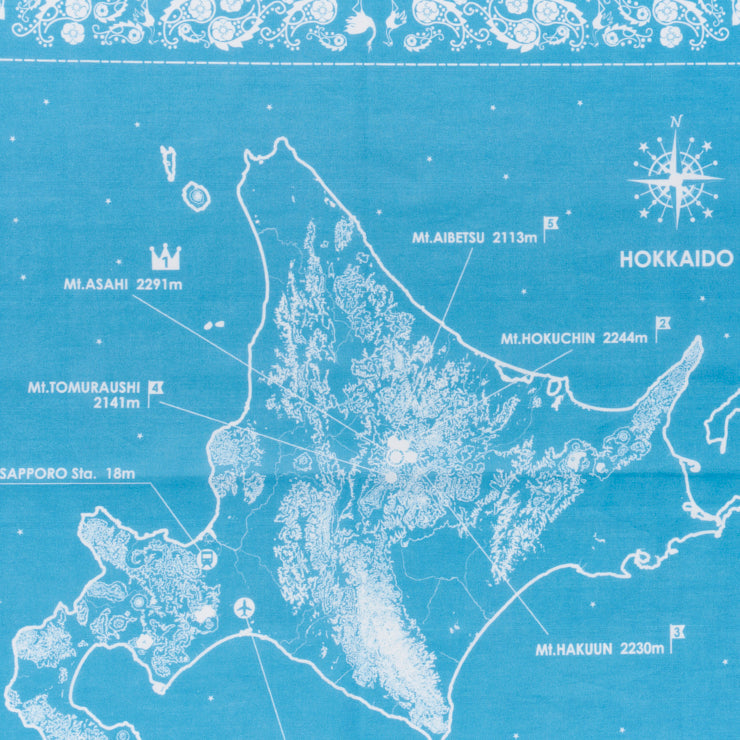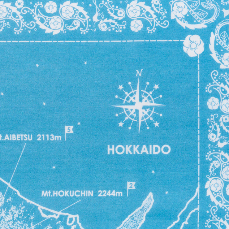 クラシックなバンダナの代名詞となっている「ペイズリー柄」の有機的なモチーフをベースに、北海道の花「ハマナス」や北海道の鳥「タンチョウ」をデザインに盛り込みました。