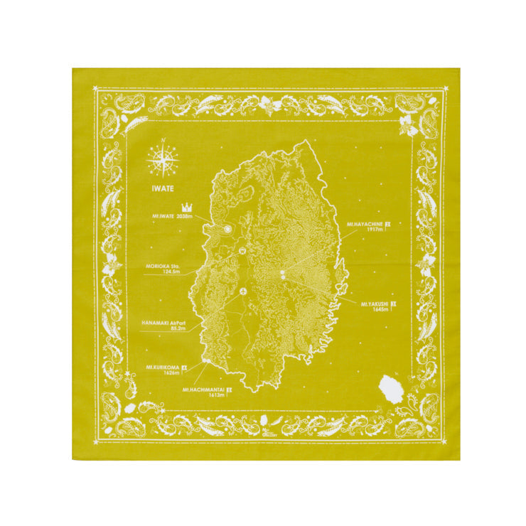 都道府県別に等高線・県の花や鳥獣などをデザインした、地理・地形への興味が深まるバンダナです。