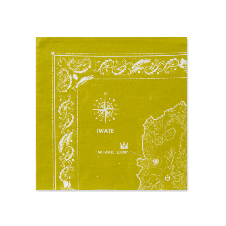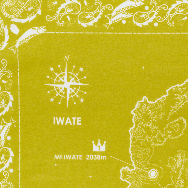 クラシックなバンダナの代名詞となっている「ペイズリー柄」の有機的なモチーフをベースに、岩手県の県の花「キリ」や県の魚「南部さけ」をデザインに盛り込みました。