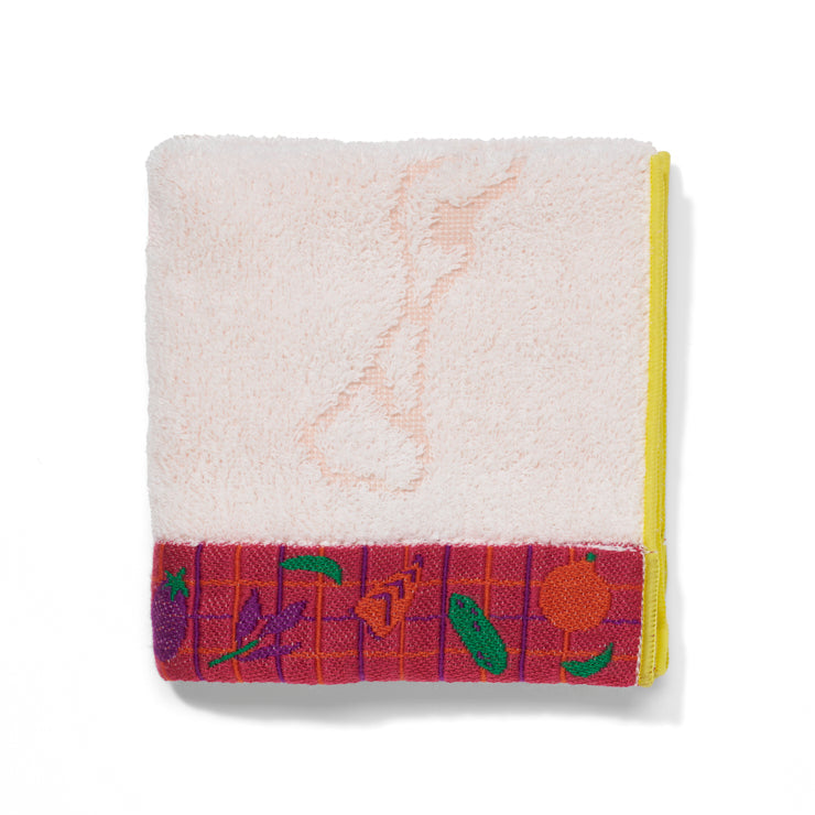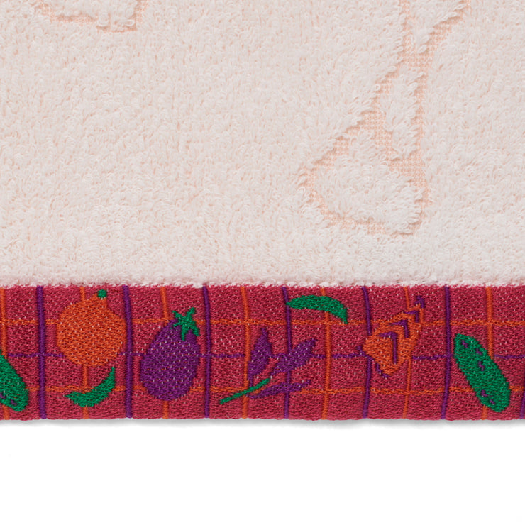 中央のタオル生地部分は透かし織で都道府県のシルエットが、タオルの端(ヘム)部分はジャカード織で上部には英字の都道府県名、下部には都道府県ゆかりのモチーフが織り込まれています。