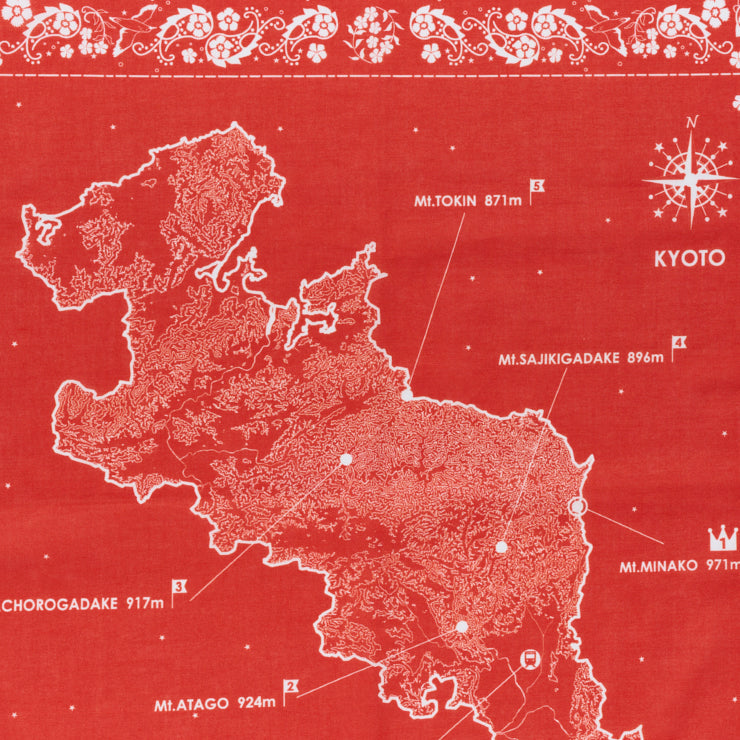 都道府県別に等高線・府の花や鳥獣などをデザインした、地理・地形への興味が深まるバンダナです。