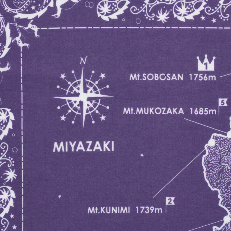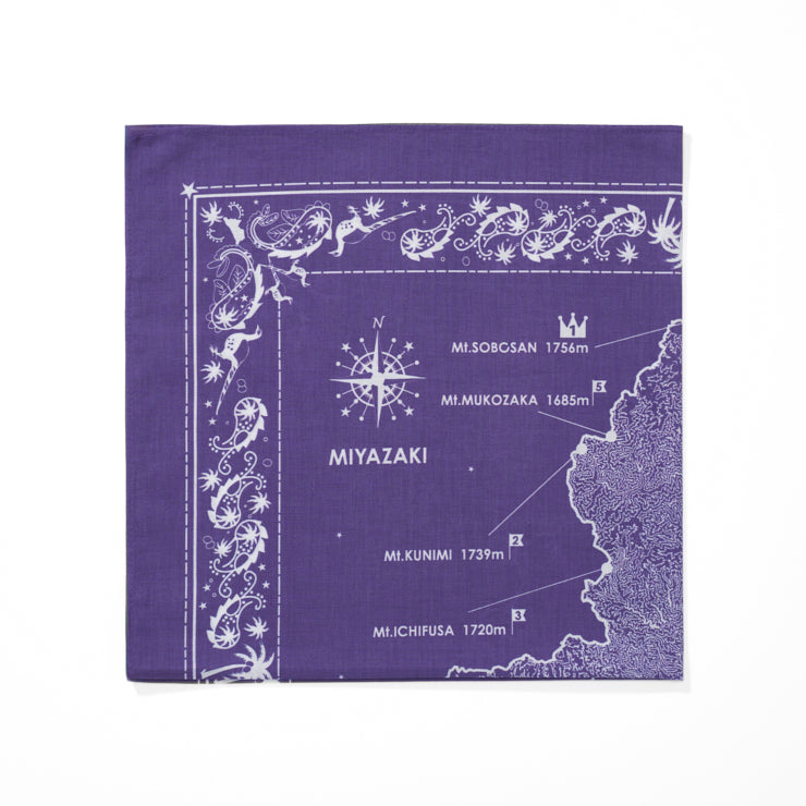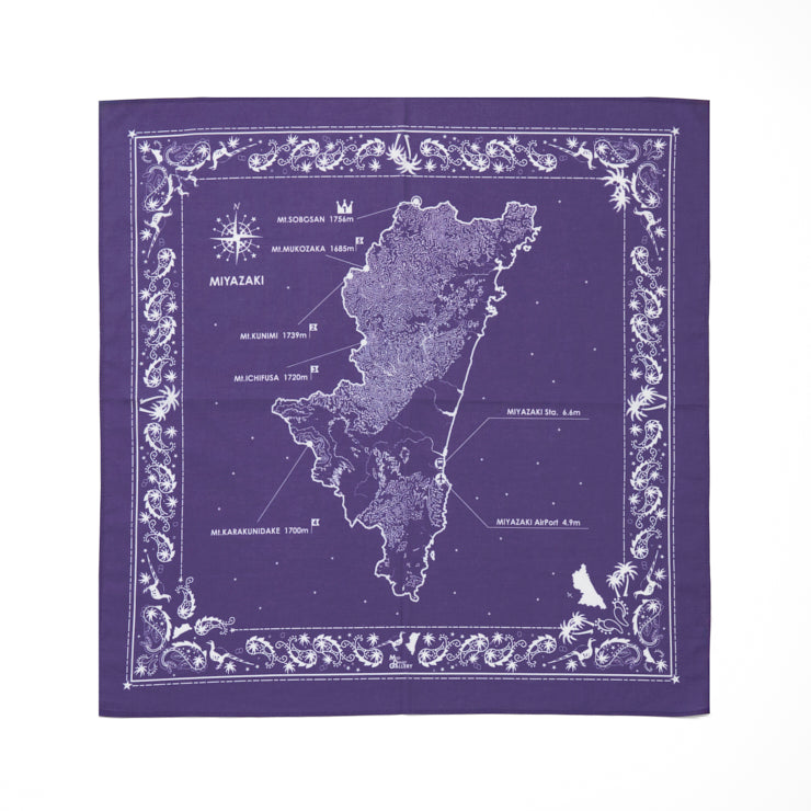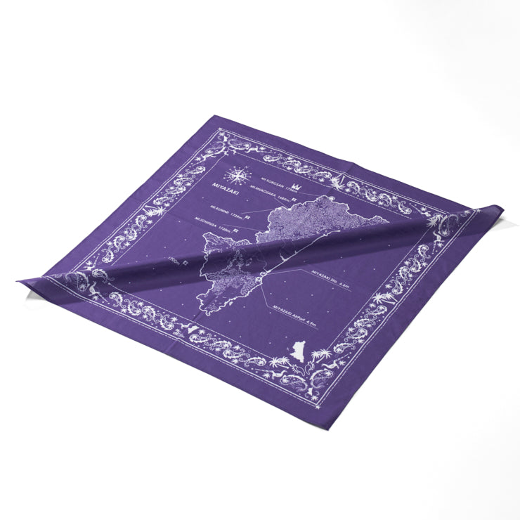 クラシックなバンダナの代名詞となっている「ペイズリー柄」の有機的なモチーフをベースに、宮崎県の県の木「フェニックス」や県の鳥「コシジロヤマドリ」をデザインに盛り込みました。
