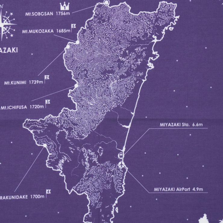 中央部分には等高線入りの県図を置き、宮崎県の中で高い山トップ5の地点や主要駅・方位磁針等を描きました。