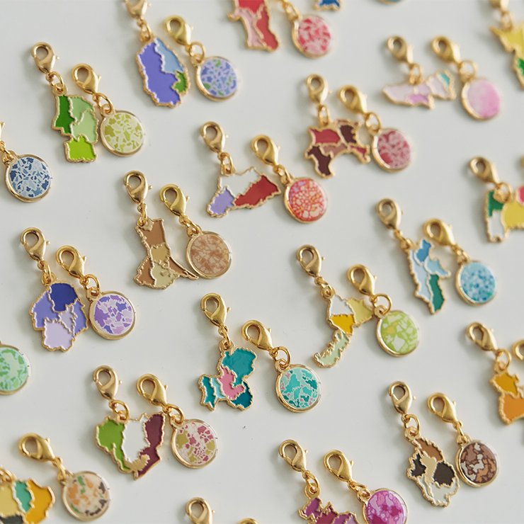それぞれのチャーム裏面には、都道府県名と方位マーク/北を表す「N」を記載しました。地図会社ならではの遊び心を詰め込んだデザインです。