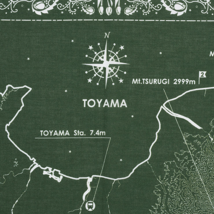 クラシックなバンダナの代名詞となっている「ペイズリー柄」の有機的なモチーフをベースに、富山県の県花「チューリップ」や県のさかな「シロエビ」をデザインに盛り込みました。