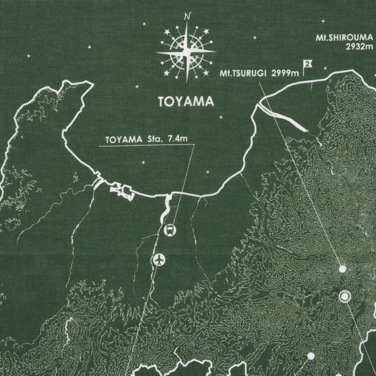 都道府県別に等高線・県の花や鳥獣などをデザインした、地理・地形への興味が深まるバンダナです。