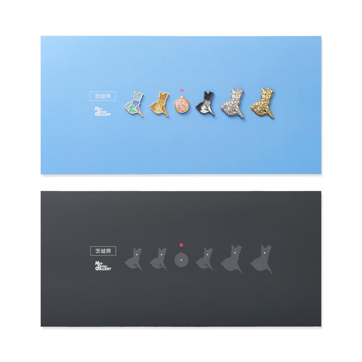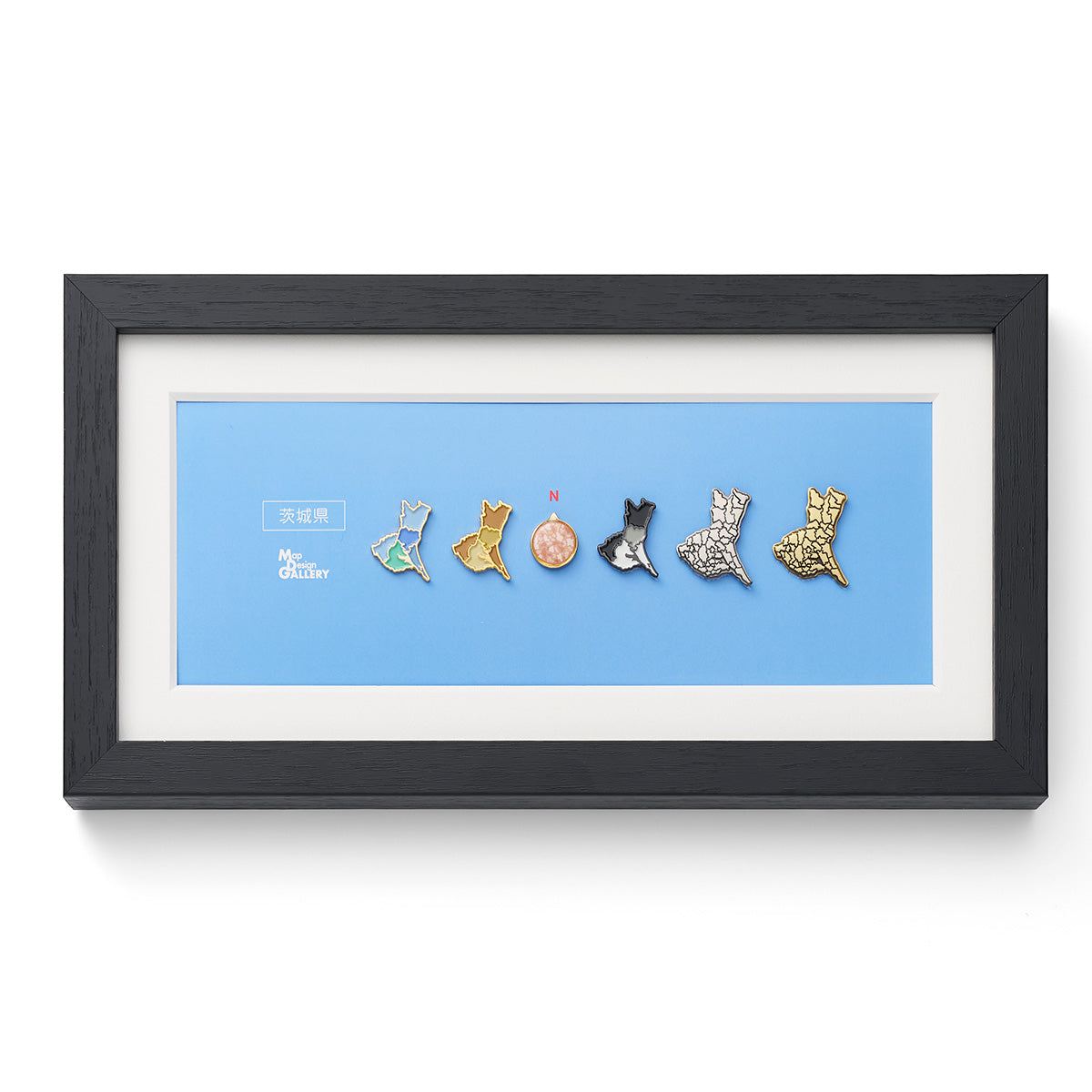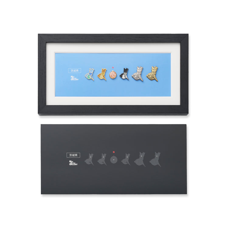 人気の都道府県型のピンバッジ5種を、スタンド付きの特製フレームに収めたセットです。机や棚の一角など、場所を問わず飾りやすいサイズに仕上げました。各都道府県にゆかりのあるモチーフをイメージにした色の台紙にセットしてお届けします。茨城県は「ネモフィラ」がカラーモチーフです。また、全ラインナップ共通で黒色の台紙も付属。気分やお部屋の雰囲気に合わせて差し替えてお楽しみいただけます。インテリアの一部として日常の中でふと目に留まり、“わたしの土地”への気持ちをやさしく思い起こさせてくれるアイテムです。