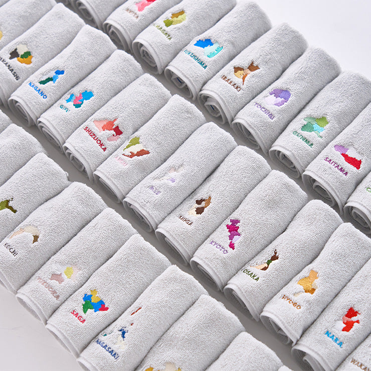 今治産の良質なライトグレーのタオル生地に、47都道府県のそれぞれの形をワンポイントで刺繍しました。