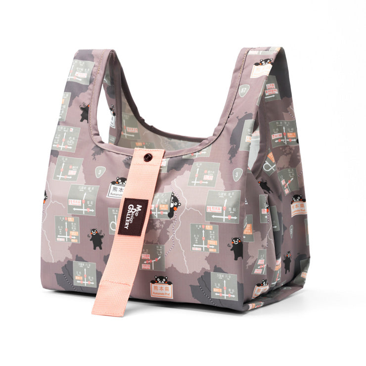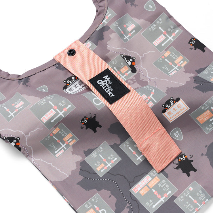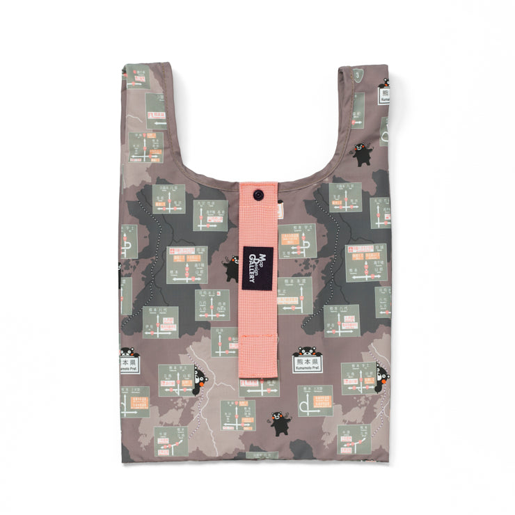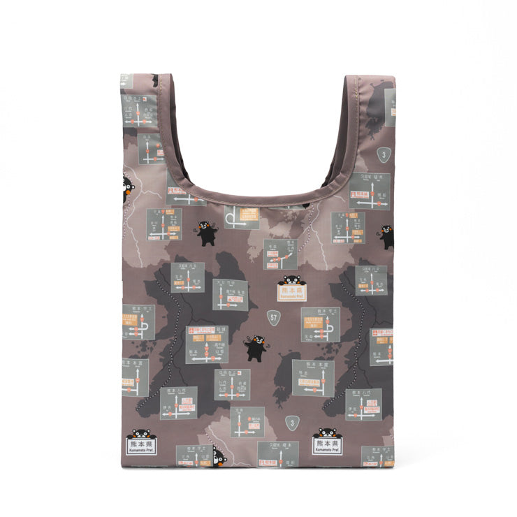 熊本県内の方面看板デザインとくまモンのイラストを全面にあしらったコンパクトなエコバッグです。