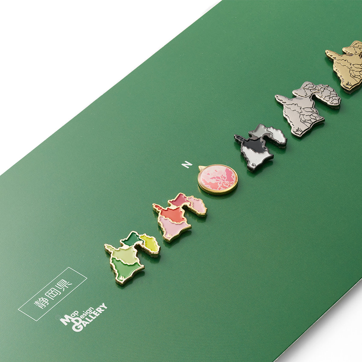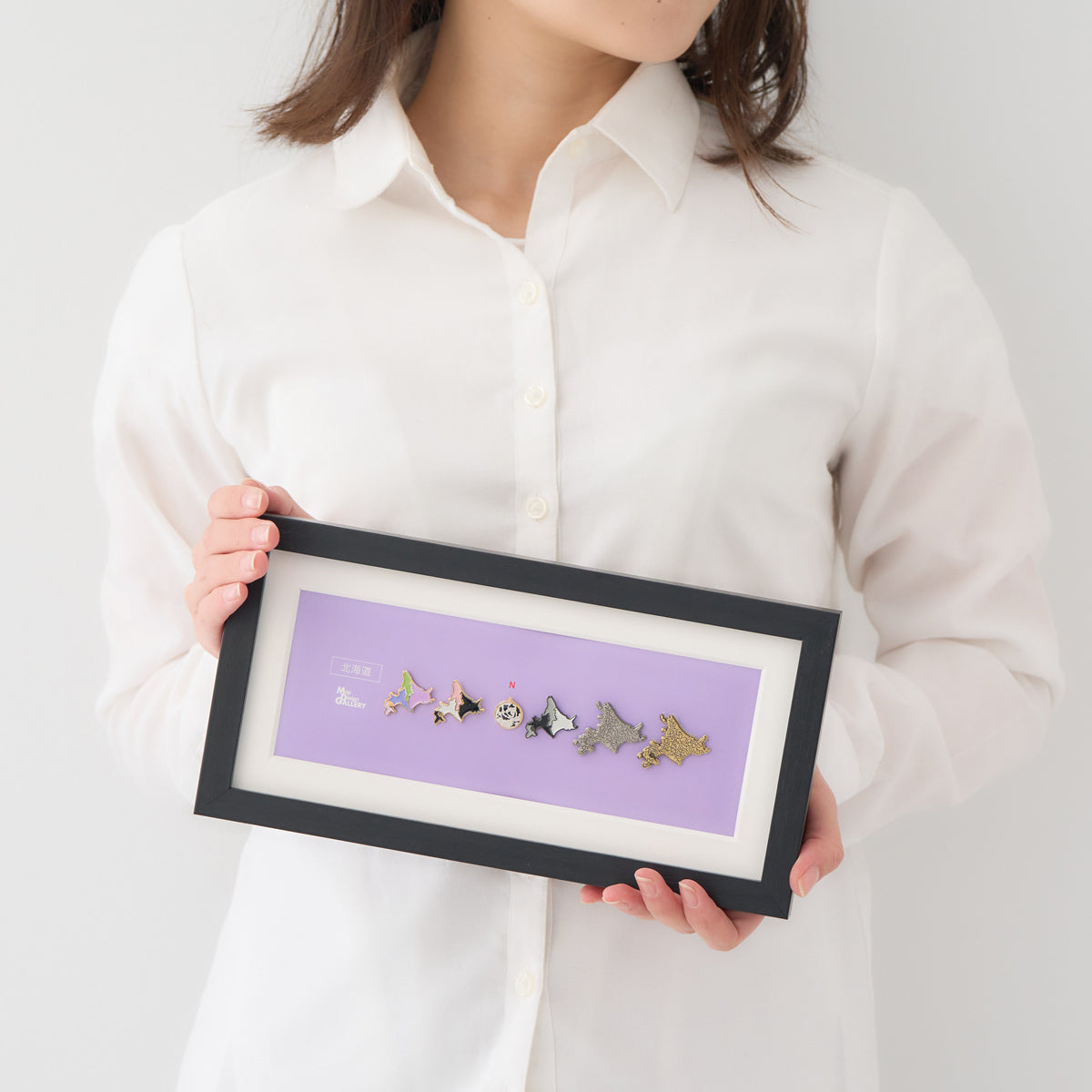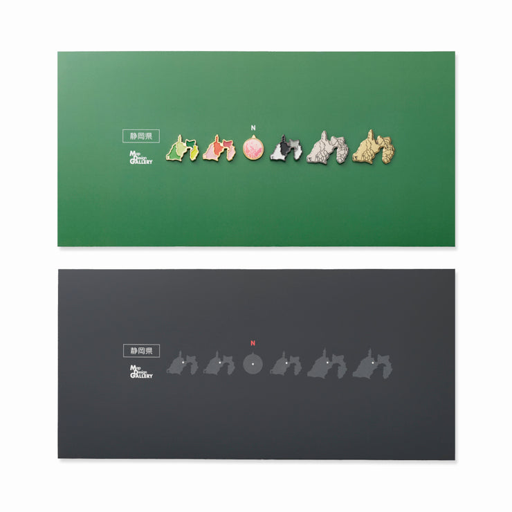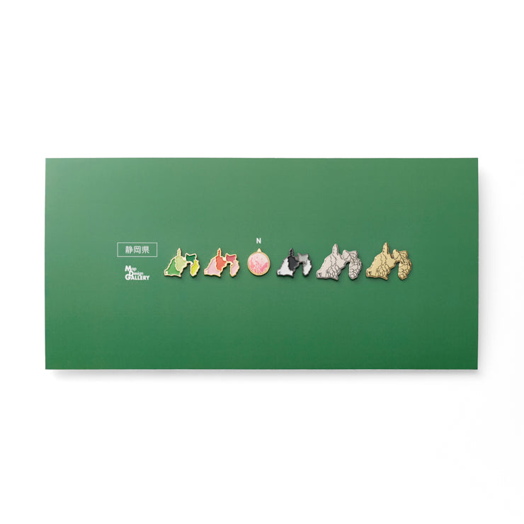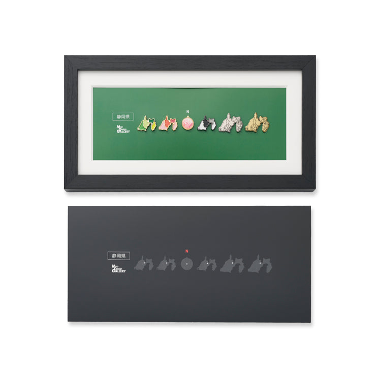 人気の都道府県型のピンバッジ5種を、スタンド付きの特製フレームに収めたセットです。机や棚の一角など、場所を問わず飾りやすいサイズに仕上げました。各都道府県にゆかりのあるモチーフをイメージにした色の台紙にセットしてお届けします。静岡県は「お茶」がカラーモチーフです。また、全ラインナップ共通で黒色の台紙も付属。気分やお部屋の雰囲気に合わせて差し替えてお楽しみいただけます。インテリアの一部として日常の中でふと目に留まり、“わたしの土地”への気持ちをやさしく思い起こさせてくれるアイテムです。