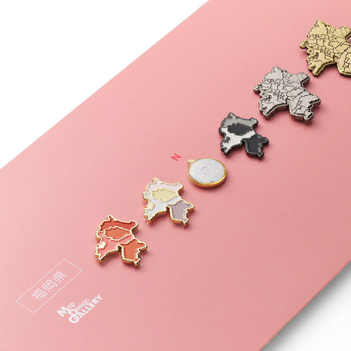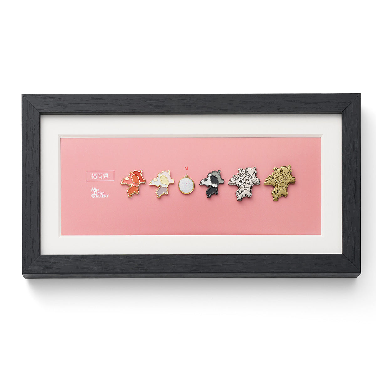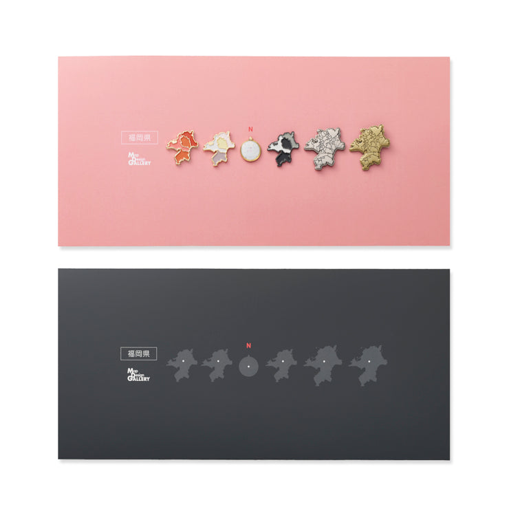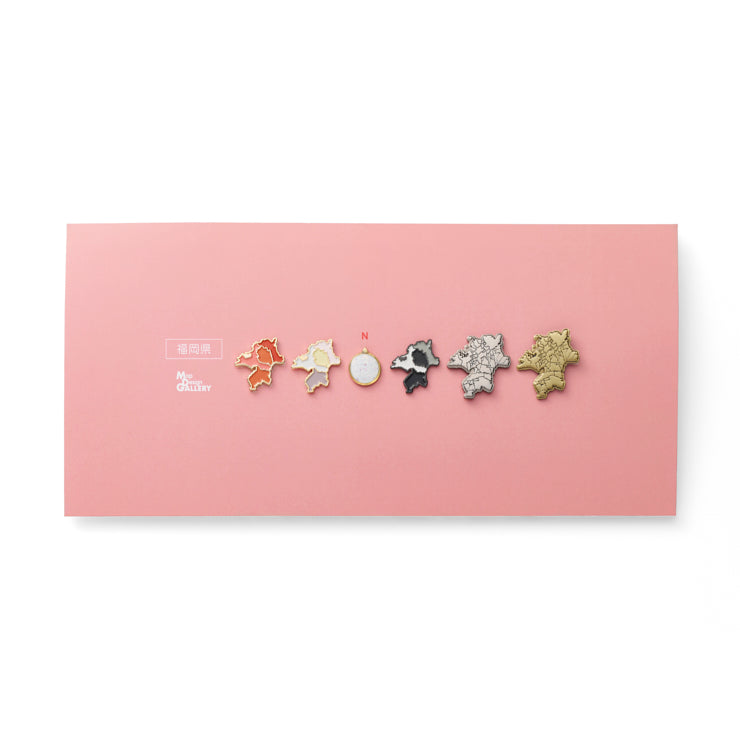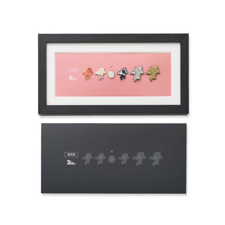 人気の都道府県型のピンバッジ5種を、スタンド付きの特製フレームに収めたセットです。机や棚の一角など、場所を問わず飾りやすいサイズに仕上げました。各都道府県にゆかりのあるモチーフをイメージにした色の台紙にセットしてお届けします。福岡県は「めんたいこ」がカラーモチーフです。また、全ラインナップ共通で黒色の台紙も付属。気分やお部屋の雰囲気に合わせて差し替えてお楽しみいただけます。インテリアの一部として日常の中でふと目に留まり、“わたしの土地”への気持ちをやさしく思い起こさせてくれるアイテムです。