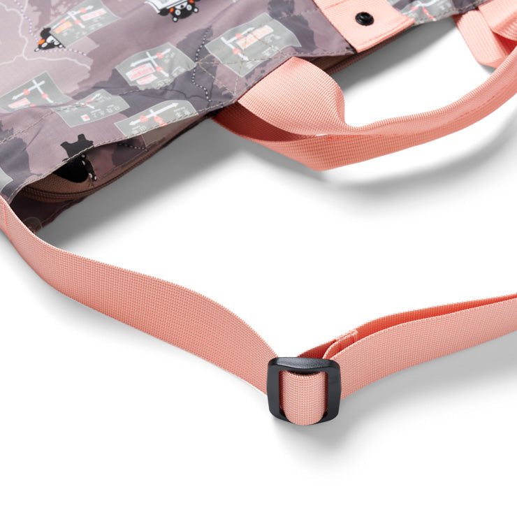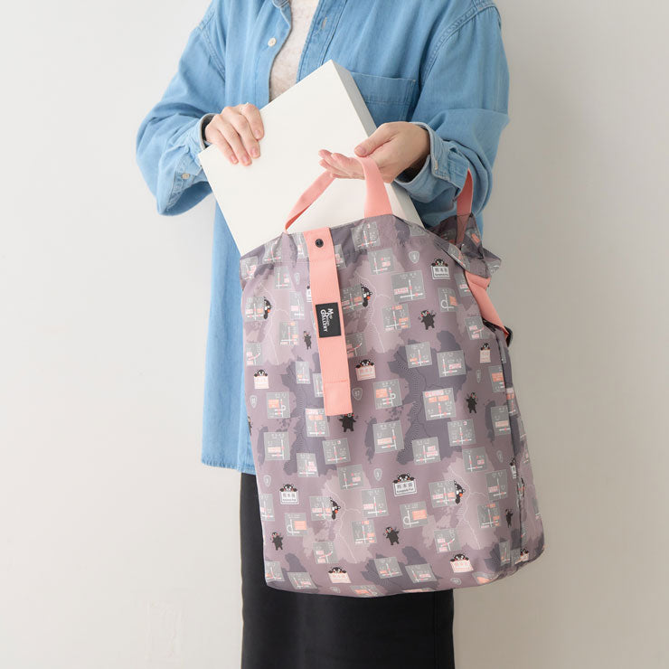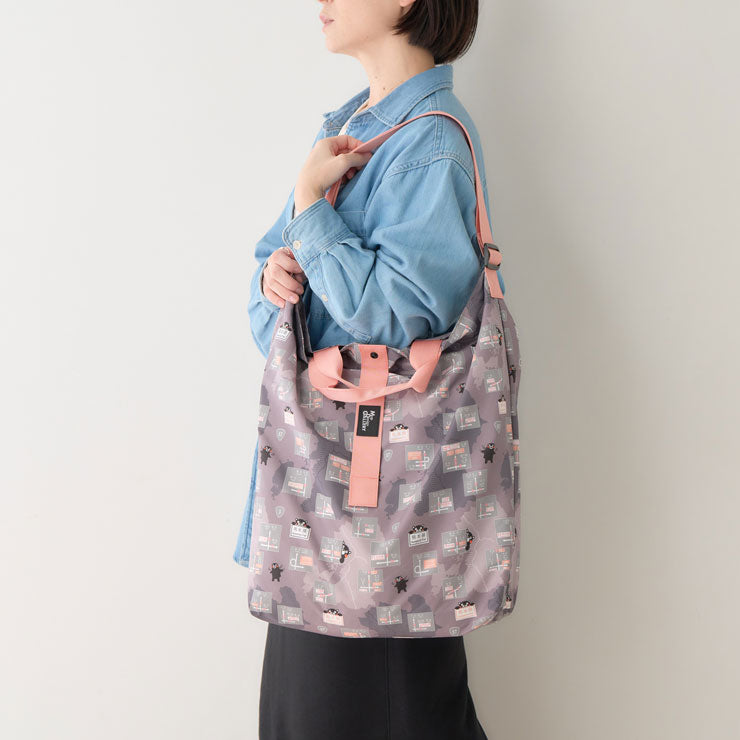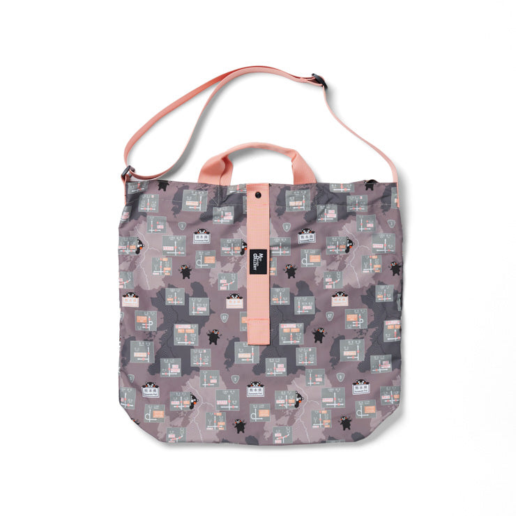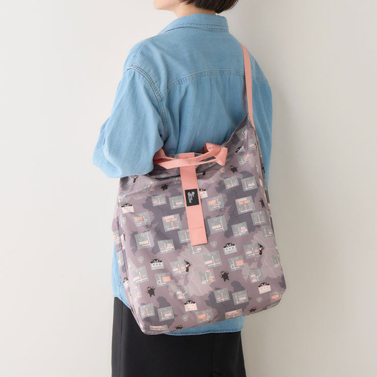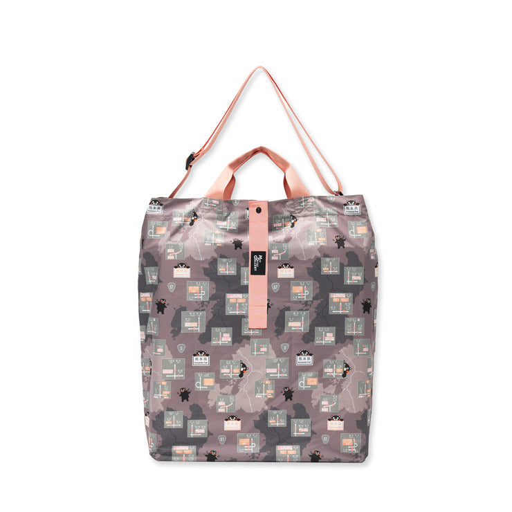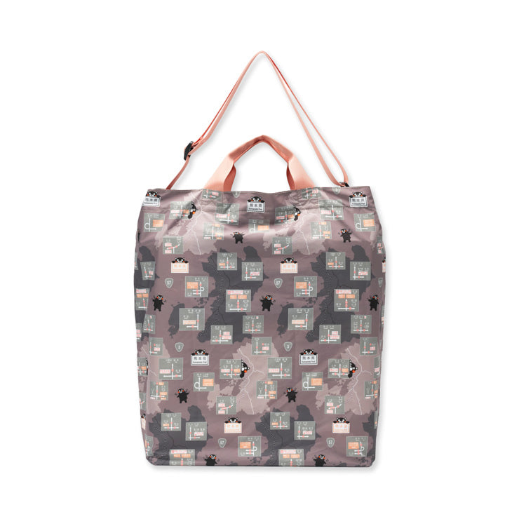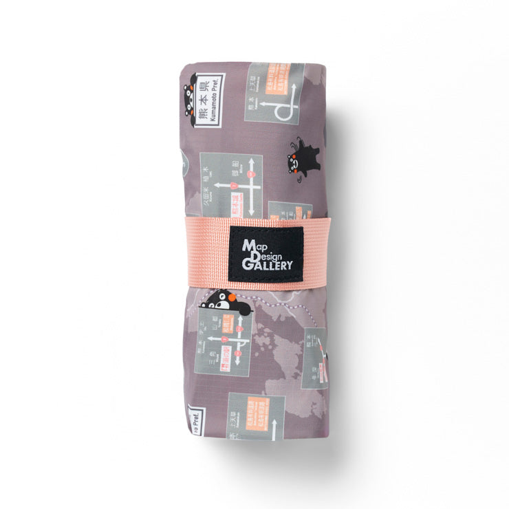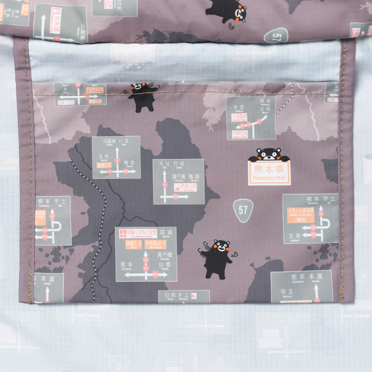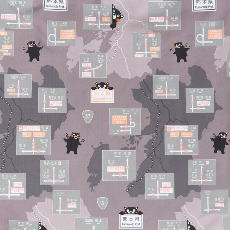 熊本県内の方面看板デザインとくまモンのイラストを全面にあしらったパッカブルバッグです。