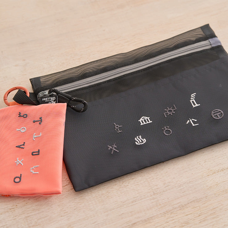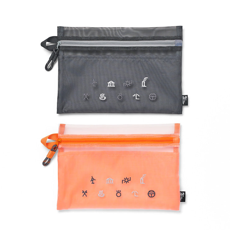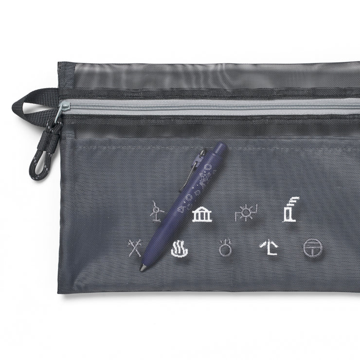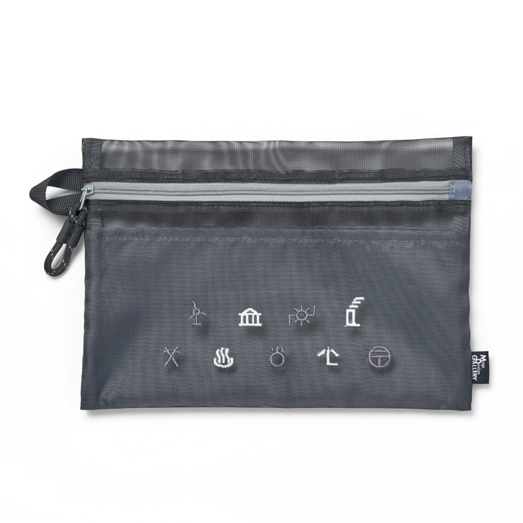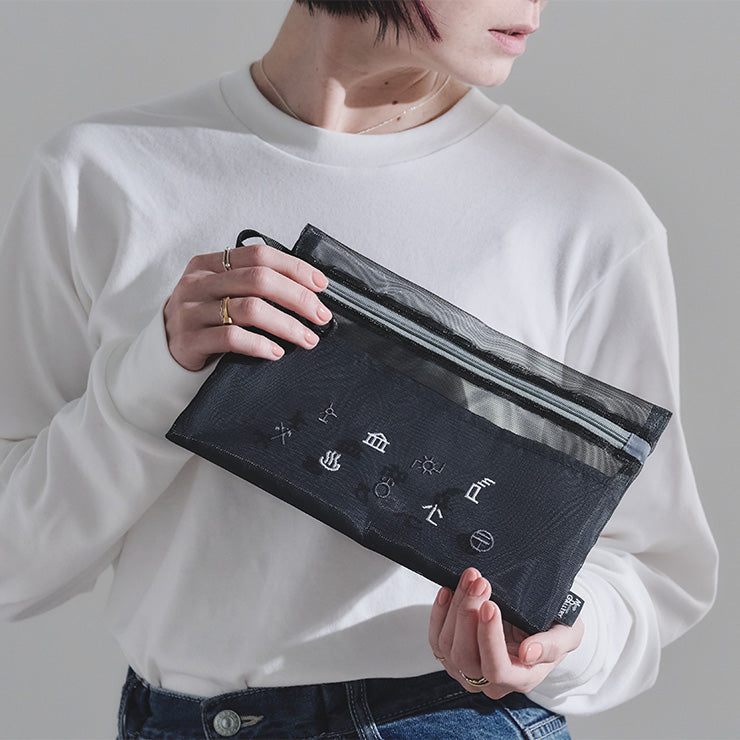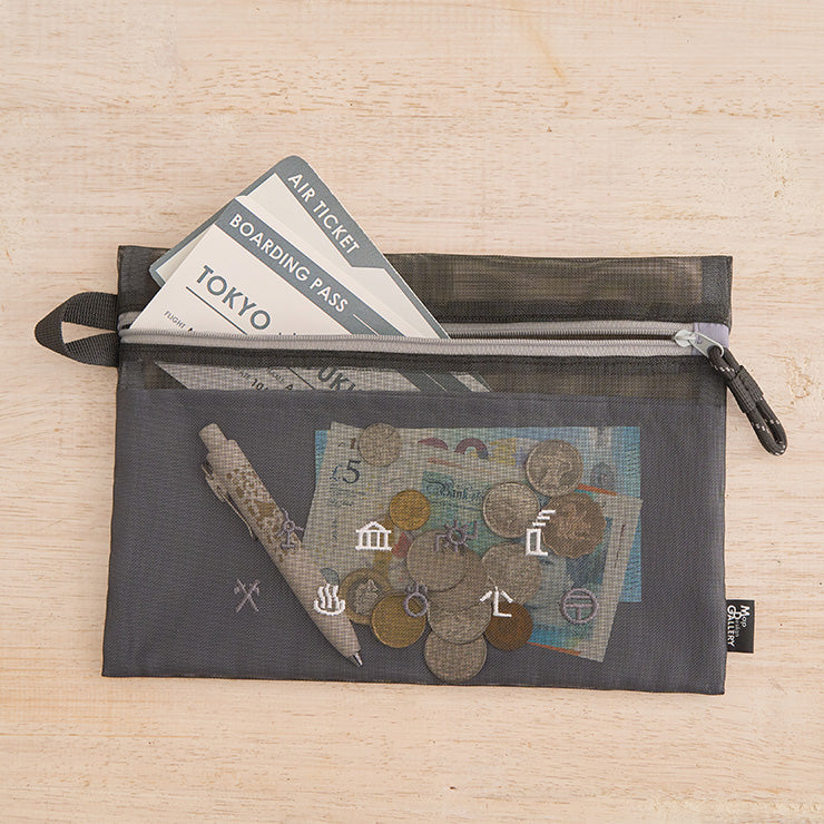 地図記号をシックに組み合わせてデザインした、メッシュフラットポーチです。