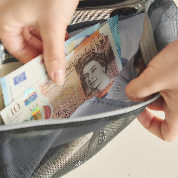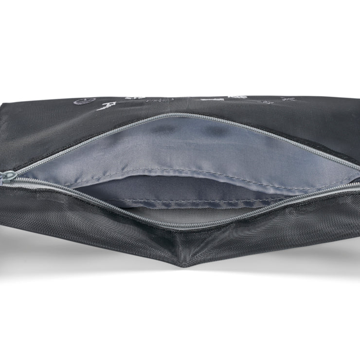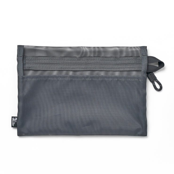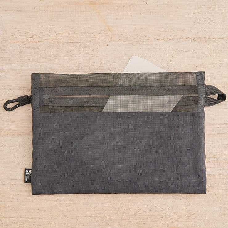 A5サイズ対応のフラットポーチです。硬さのあるハードメッシュ素材を使用し、形崩れしにくい仕様です。内側は裏地付きで中身が見えにくく、パスポートやチケットなども安心して収納可能。軽量で持ち運びやすく、旅行時のバッグインバッグとして活躍します。文具類の小分けにも適した、旅と日常の両方で使いやすいアイテムです。