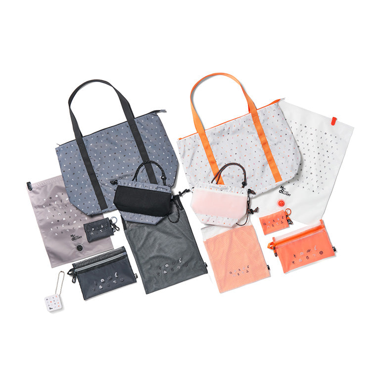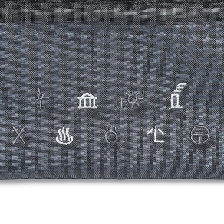 種類豊富な地図記号のうち、建物・植生・構造物・特定地区に関わる9種を組み合わせ、ブラックのハードメッシュにグレーの裏地を使っています。どんなシーンでも使いやすいベーシックなモノトーンでデザインしました。