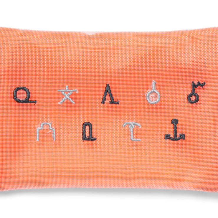 種類豊富な地図記号のうち、建物・植生・構造物・特定地区に関わる9種を組み合わせ、ホワイトのハードメッシュにオレンジの裏地を使い、旅行シーンを盛り上げるアクティブな雰囲気のデザインです。カラビナ部分は本体に合わせてオレンジで仕上げています。